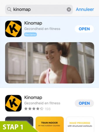 Először is töltse le a Kinomap alkalmazást ingyenesen az App Store-ból vagy a Google Play-ről (1. lépés).