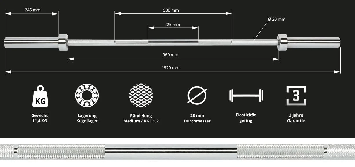 Az ATX Athletic series olimpiai rúd 50mm x 152cm-es kivitelben kapható. Professzionális súlyzó 152 cm hosszú méretben, golyóscsapágyakkal. Ez a rövid súlyzórúd elengedhetetlen a különféle edzésváltozatokhoz, és minden edzőteremben megtalálható, illetve kötelező elem. A kiváló recézés kényelmes és biztos fogást biztosít. A golyóscsapágyas rögzítések selymesen sima, rándulásmentes koncentrikus futást biztosítanak, melynek előnyei a különféle gyakorlatok során érvényesülnek, mint például bicepsz hajlítás vagy tricepsz nyújtás. A kiváló minőségű felület robusztus krómozással és a nagy, akár 350 kg-os teherbírással első osztályú, hosszú élettartamú minőségi terméket garantál. Kiváló minőségű súlyzó az Athletic sorozatból – ideális ambiciózus sportolók és professzionális edzőtermek számára.