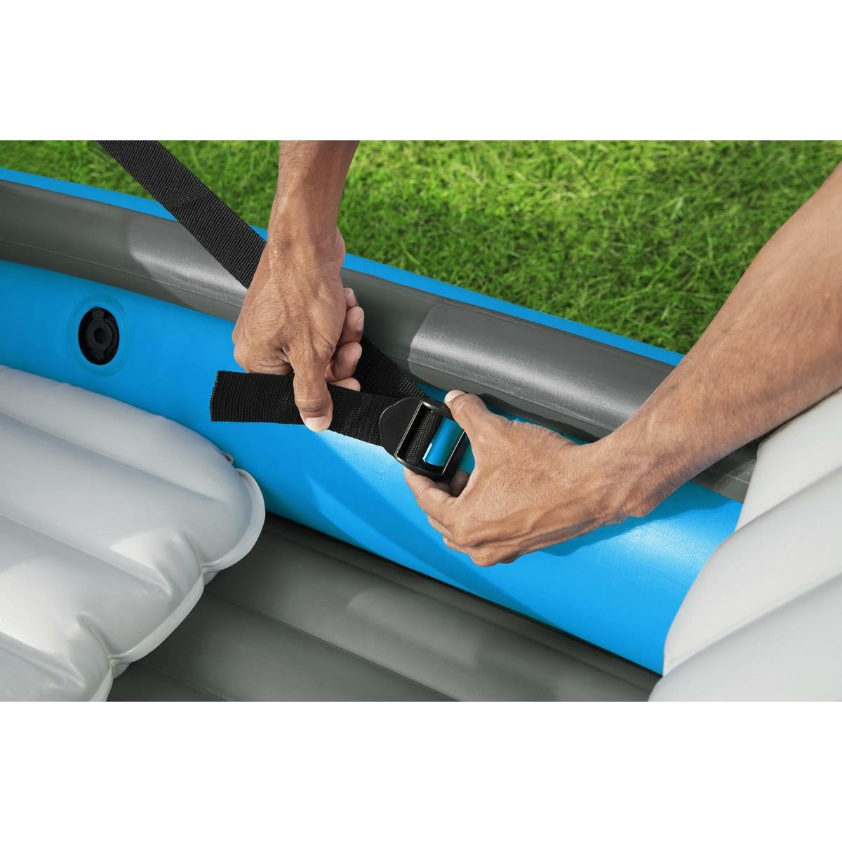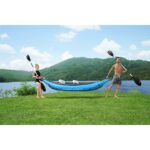 A Bestway Cove X2 kajak egy felfújható két személyes kajak a vizi sportok szerelmeseinek. Élvezze a nyarat, és hagyja magát sodródni a tavon, folyón vagy tengeren egy felfújható kajakban. Ez a kétszemélyes kajakkészlet mindent tartalmaz, ami egy nagyszerű naphoz szükséges a vízen a csomag tartalmaz 2 evezőt, egy pumpát és egy javítótapaszt. Gyors és egyszerű összeállításhoz tervezték. A kajak könnyen felfújható a mellékelt Air Hammer™ kézi pumpával. A kényelmes, nagyméretű ülőrész két felfújható ülést tartalmaz, háttámlával az extra támasztásért. Emellett rengeteg tárolóhelyet kínál a rágcsálnivalók, egyéb felszerelések vagy bármilyen más szükséges vízi eszközök számára. Könnyen úszik a vízen az alján lévő uszonyokkal, amelyek eltávolíthatók a könnyű és kompakt tárolás érdekében. A felfújható padló erős és merev. A szállítás vagy a lehorgonyzás gyerekjáték a feltekert kötéllel. A rugalmas zsinór praktikus az alapvető dolgok rögzítéséhez.