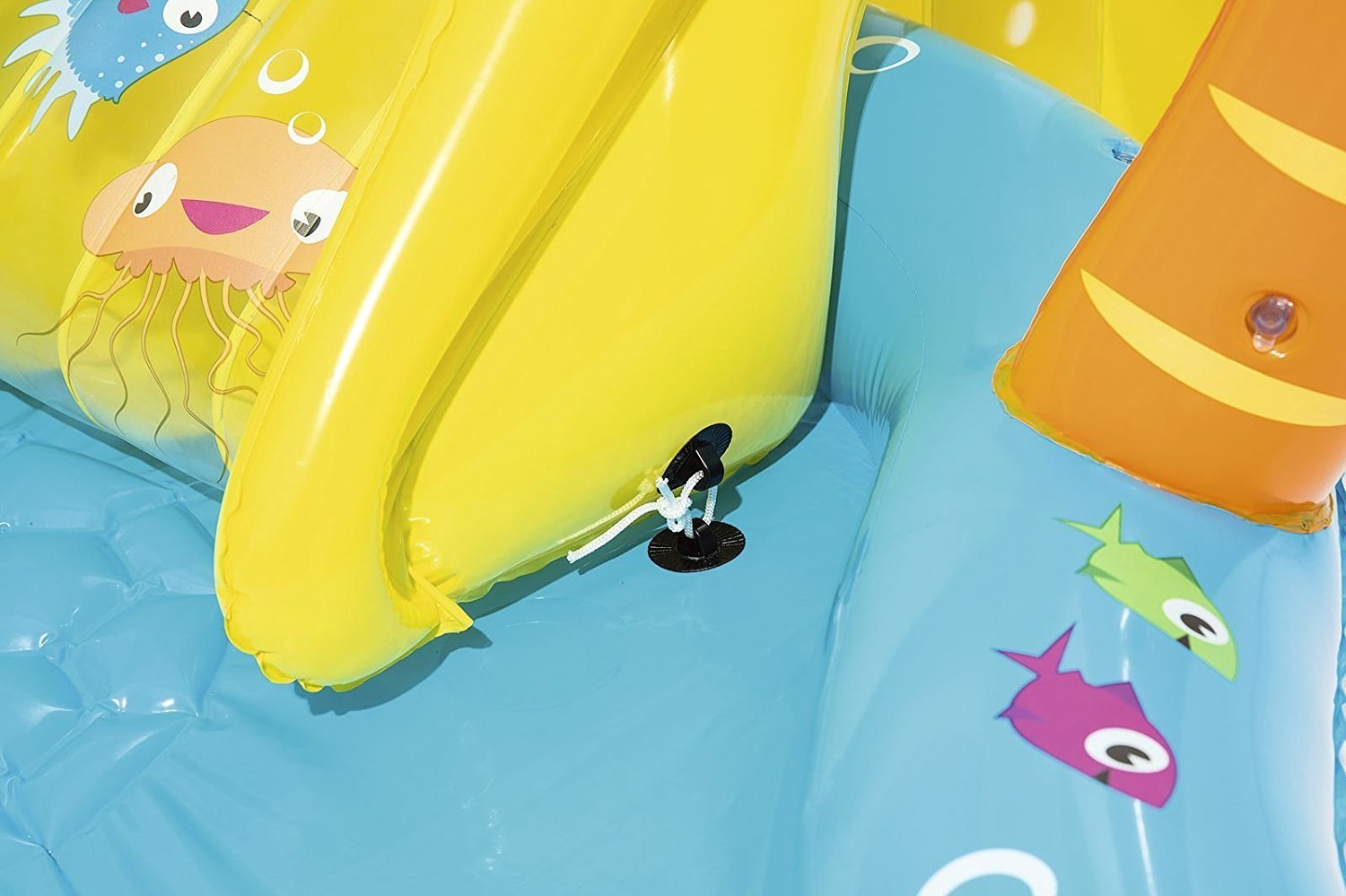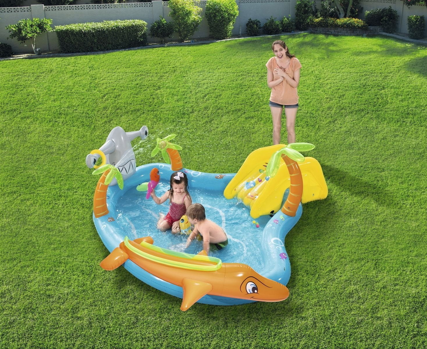 A Bestway See Life Play center lubickoló medence egy 280x257x87cm méretű gyermek puhafalú medence. Többféle játéklehetőséggel rendelkezik, mely kellemes időtöltést biztosít gyermekeink számára. Gyorsan és egyszerűen telepíthető, hiszen könnyű súlya miatt bárhova hordozhatjuk, egyszerűen felfújhatjuk. Integrált permetező rendszer van beépítve az egyik pálmafába, mely kerti tömlős csatlakozóval rendelkezik. A csúszda kivehető, illetve behelyezhető egyszerűen. Integrált kábelvezetőkkel rendelkezik, így könnyedén rögzíthetjük azt. A medence test védelme érdekében, ajánlatos leteríteni valamit alá!