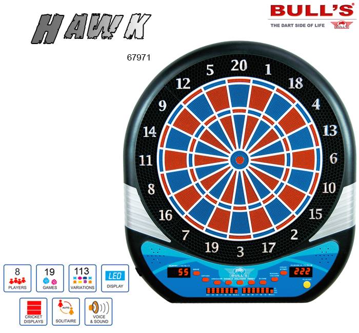 A Bull’s Hawk elektromos dart táblát egyenesen Németországból 2 év garanciával szállítjuk. Kiváló minőségű darts szett, melyhez tartozék 4db darts szett az-az 12db darts és plusz 30db tartalék hegy a darts nyilakhoz. A dart tábla adapterrel használható. Alkalmas 1-8 játékos számára, akik 19 játék és 113 játék variáció közül választhatnak! A játék állását 4db LED kijelzőn tekinthetjük meg, melyen folyamatosan nyomon kisérhetünk minden fontos adatot! Adart táblához természetesen az adapter is tartozék és egy dobóvonal, mely segítségével mindig a pontos helyről dobálhatjuk darts nyílainkat!