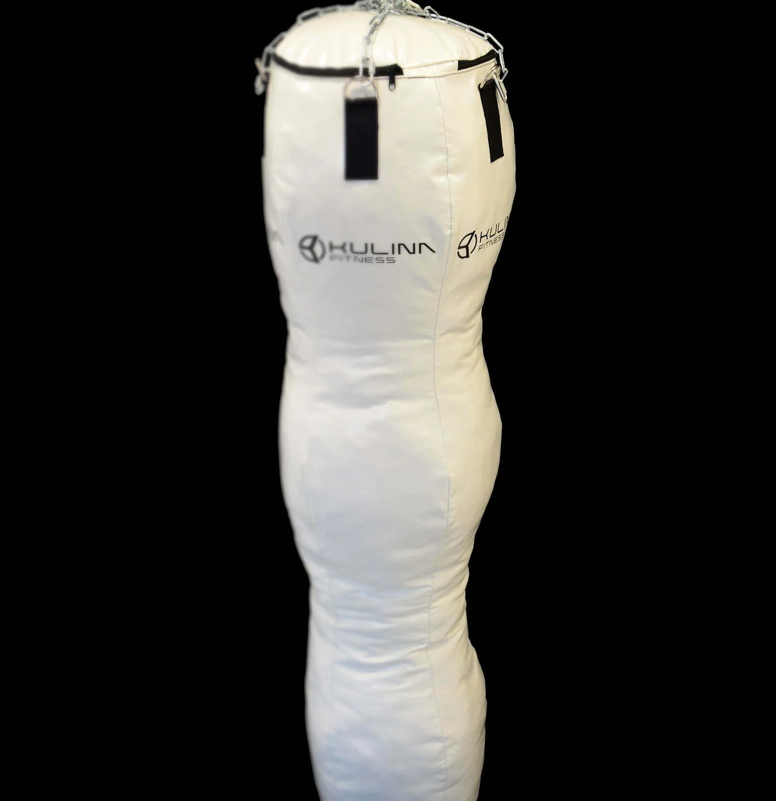 A Kulina Fitness test alakú boxzsák lánccal, mely kiváló minőségű vynilből készült. Speciális kialakításának köszönhetően speciális edzésekhez is használható. Leginkább a pontos és erőteljes test ütésekhez, és rugásokhoz használható más sportágakban. Speciális kialakításának köszönhetően, többféle különleges ütéskombináció és rugáskombináció is gyakorolható vele. Rendkívül tartós és könnyedén tisztítható zsák. Feldolgozott textil hulladékkal töltött. Töltve szállítjuk, négy ponton rögzített krómozott lánccal és forgó fejjel együtt. Kb 150-160cm-es magassággal rendelkezik. A zsákot géppel töltik az egyenletes töltöttség érdekében. Minden töltött zsák scannerrel átvilágítva, hogy véletlen se kerüljön bele fém anyag a töltelékbe! Hosszú élettartalmú zsák hobbi és haladó felhasználásra.