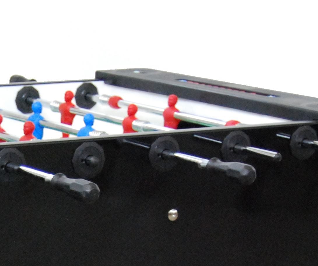 A 11 mm vastag edzett üveg játéktér* gyors, precíz és ellenálló felületet kínál, amely hosszú távon is megőrzi fényét és simaságát (nem tartozék, csak választható opció). A csapágyazott acél rudak ergonomikus fogantyúkkal vannak ellátva, így könnyed, mégis kontrollált játékot tesznek lehetővé. A játékosfigurák tökéletes súlyelosztása pontos passzokat és erős lövéseket biztosít, így a játék valóban professzionális szintre emelhető.