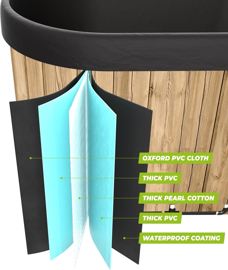 Ez a jégfürdő kiváló minőségű, víz- és UV-álló anyagokból készült, így alkalmas hosszú távú kültéri használatra. A masszív váz 8 tartólábakkal van felszerelve a fokozott stabilitás érdekében, míg az 5 hőszigetelő réteg segít fenntartani a víz hőmérsékletét még hosszabb használatok során is. A szélek Oxford PVC-vel vannak bevonva, ami további kényelmet biztosít használat közben.